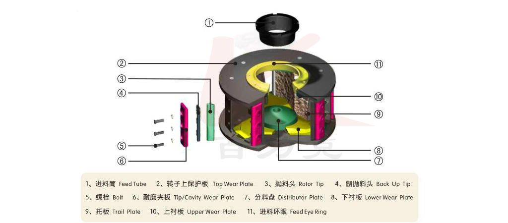當入料量達到葉輪滿載量的70%-90%時,產砂量達到最高。給料量過小,不僅降低了產出量還會增高耐磨件磨損量。給料量過大時,產砂量會降低。因為破碎腔內的石料流較大,轉子拋出的石料大部分打在石料流上而不是打在拋料頭上的緣故。