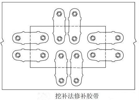- 膠帶出現窟窿可采用挖補法。首先,將損壞處挖去一方塊,然后裁切一塊同樣尺寸的膠帶片填補窟窿并沿方塊四周用膠帶扣卡好(如下圖所示)。補上去的膠帶片可以在舊膠帶上截切,但要與所使用膠帶有同樣的規格尺寸,膠帶芯的經緯線方向要與所使用的膠帶的方向一致。