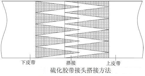 膠帶修補的最后方法就是重新做膠帶接頭,這種方法適用于膠帶損傷較重,已不能承受其運轉時的張力,若在運轉下去將可能發生斷帶的情況。重新做膠帶接頭方法很多,主要有機械扣連接法及硫化熱接法等。在條件允許的情況下應優先采用硫化熱接法,硫化而成的膠帶接頭質量好,抗拉強度高,但是硫化法通常工序比較復雜,使用的時間也較長。對于整芯膠帶的硫化通常是按下圖所示,按照一定的尺寸將需要對接的膠帶頭裁剪成鋸齒狀,在鋸齒的接觸面涂上硫化膠后將兩膠帶頭搭接,然后再在搭接處上下兩面覆蓋芯膠及面膠經加熱、加壓后硫化成一個整體。