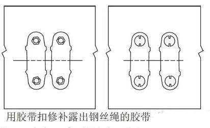- 鋼絲繩芯膠帶經常被物料砸出鋼絲繩,修補時可沿鋼絲繩裂縫的長度打上膠帶扣來修補(如下圖所示)。板式膠帶扣部件雖小但在修補膠帶方面卻十分方便,可以將膠帶的小損傷很好的控制,防止膠帶損傷擴大。