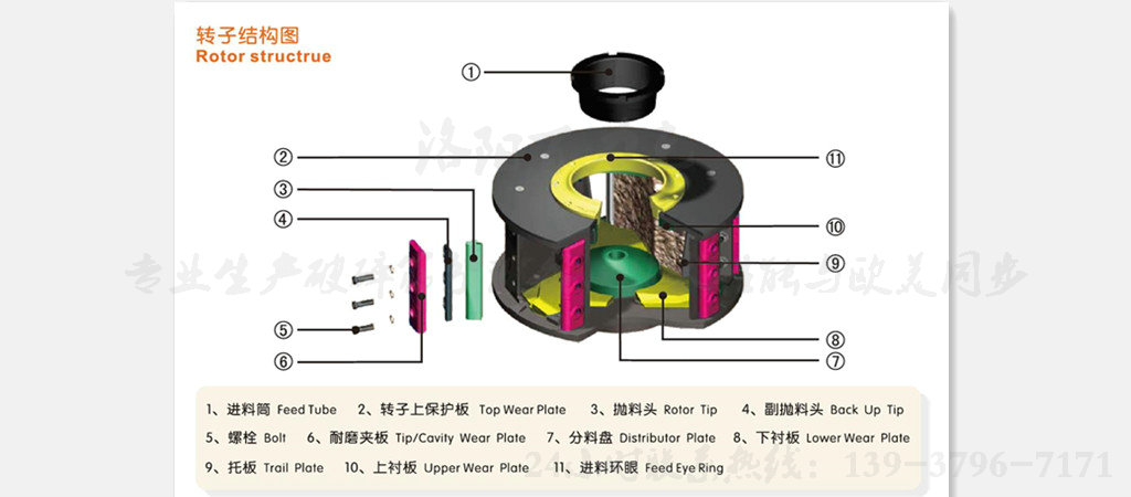 物料由進料斗進入立軸沖擊式破碎機,經分料器將物料分成兩部分,一部分由分料器中間進入高速旋轉的葉輪中,在葉輪內被迅速加速,其加速度可達數百倍重力加速度,然后以60-70米/秒的速度從葉輪三個均布的流道內拋射出去,首先同由分料器四周自收落下的一部分物料沖擊破碎,然后一起沖擊到渦支腔內物料襯層上,被物料襯層反彈,斜向上沖擊到渦動腔的頂部,又改變其運動方向,偏轉向下運動,從葉輪流道發射出來的物料形成連續的物料幕。這樣一塊物料在渦動破碎腔內受到兩次以至多次機率撞擊、磨擦和研磨破碎作用。被破碎的物料由下部排料口排出。在整下破碎過程中,物料相互自行沖擊破碎,不與金屬元件直接接觸,而是與物料襯層發生沖擊、磨擦而粉碎,這就減少了角污染,延長機械磨損時間。渦動腔內部巧妙的氣流自循環,消除了粉塵污染。