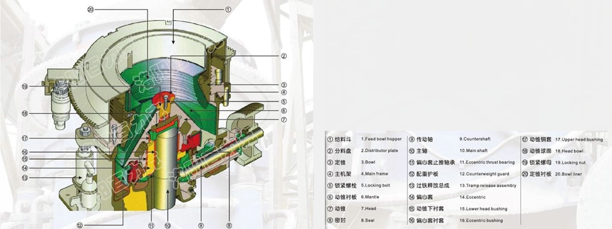液壓圓錐破碎機采用了與上代液壓圓錐破完全不同的主軸結構:定軸超大直徑主軸;高鉛青銅合金軸承;可調大沖程偏心套。